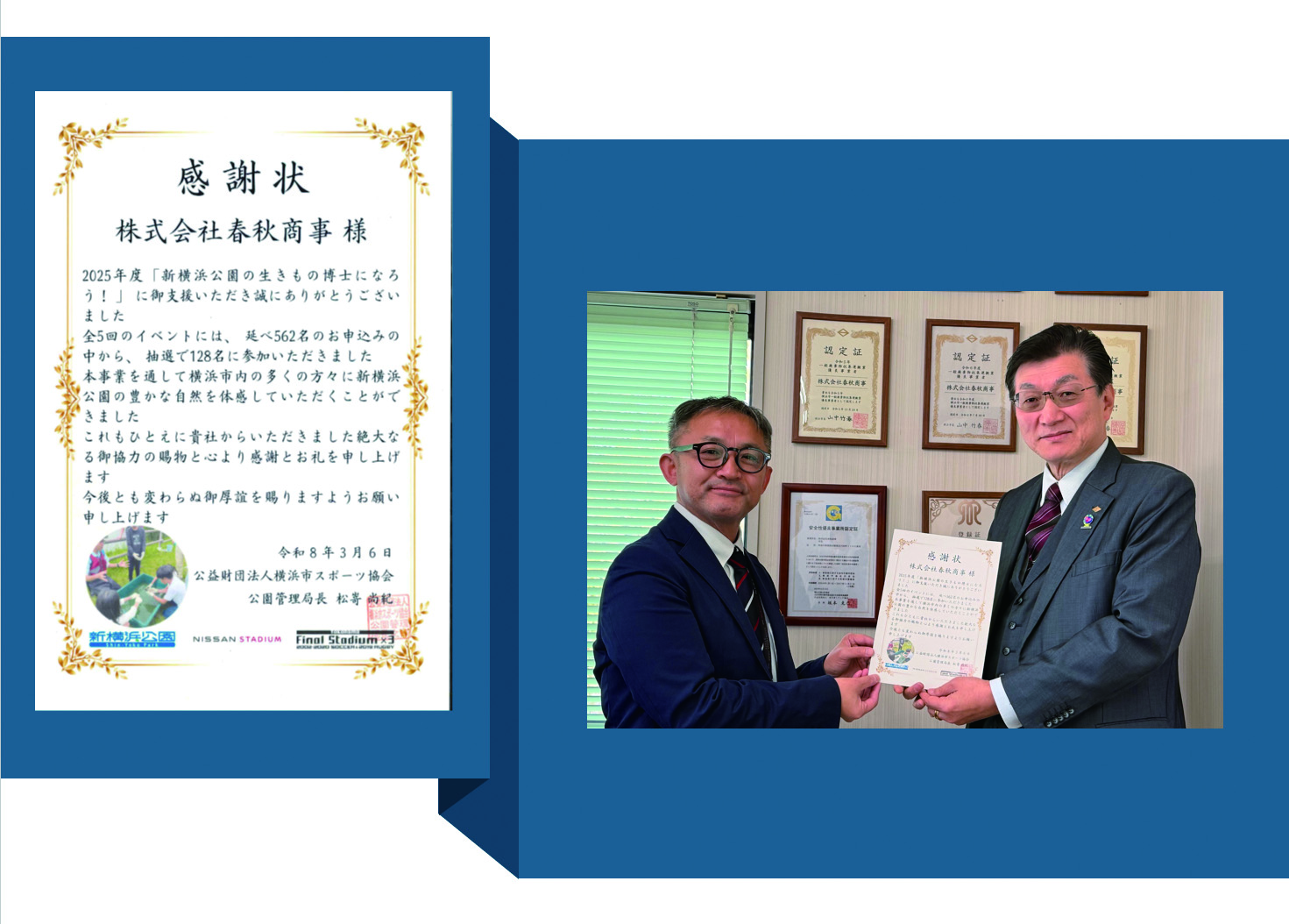公益財団法人スポーツ協会様より、甲斐事業部長ほか2名が来社され、地域貢献活動の一環として協賛している"新横浜公園の生きもの博士になろう!"の実施報告を受けると共に、感謝状の贈呈も頂きました。